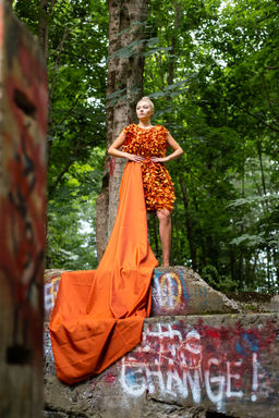 This dress was inspired by the interlocking of roots. The iridescent fabric allowed for a play on the orange-yellow threads that created this textile. The use of smocking coupled with the idea of the fibbonachi sequence allowed for the exponential growth of the size of the smocking from the shoulder down to the train.